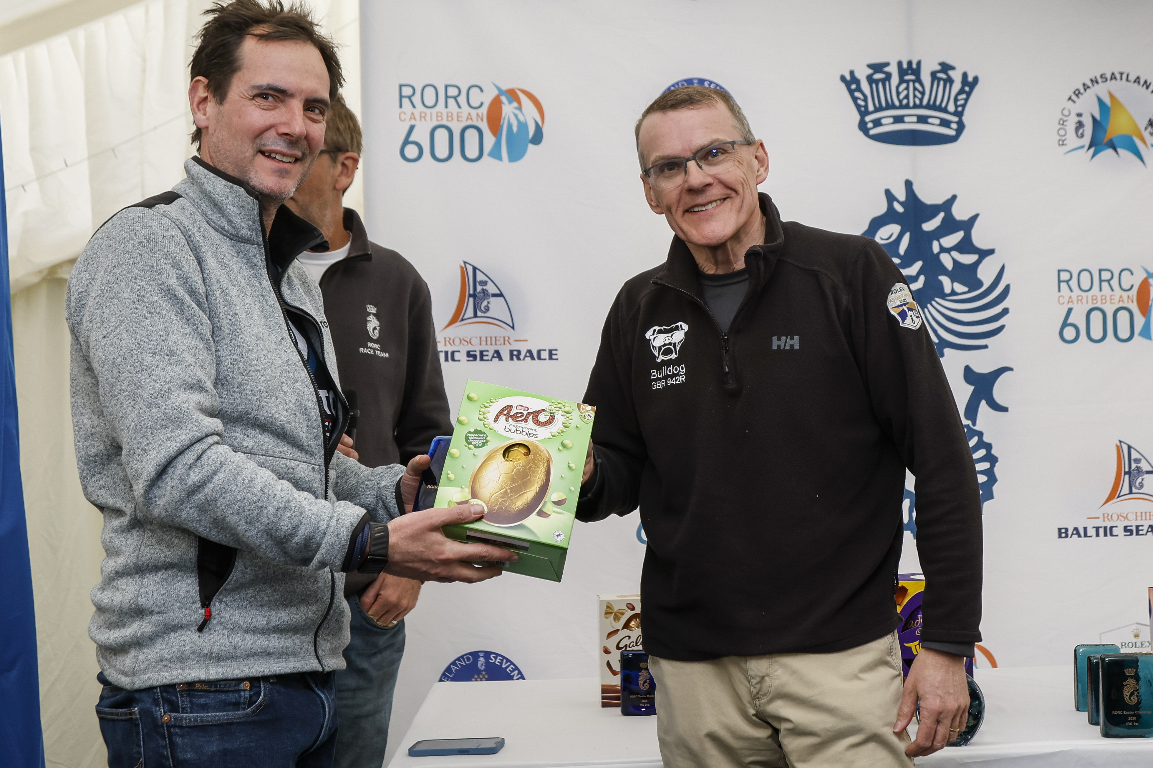 The RORC Easter Challenge Prize Giving was held at the RORC Cowes Clubhouse. RORC Racing Manager Chris Jackson thanked the RORC team and all the competitors. RORC Vice Commodore Derek Shakespeare, who had been racing his J/122 Bulldog, presented class winners with their prizes and performed the traditional Easter Toss to competitors.