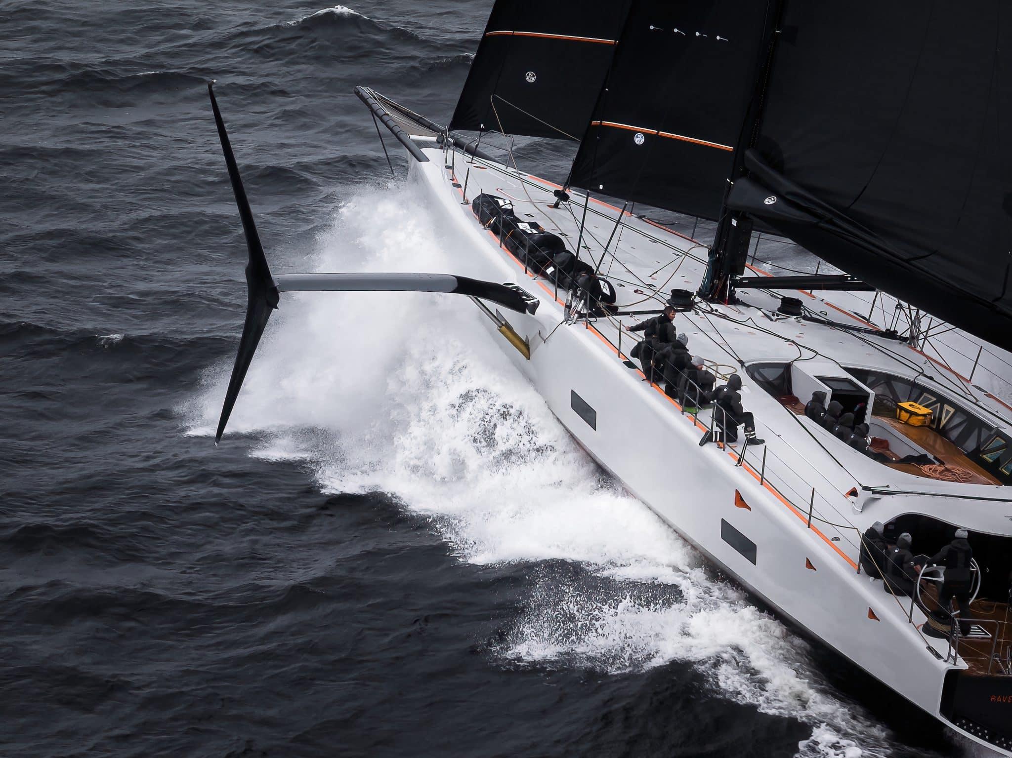 Designed by Botin Partners, Raven is the first yacht of her size purpose-built with adjustable side mounted hydrofoils to generate righting moment, combined with around 10 tonnes of water ballast. The concept allows the yacht to prioritise average speed rather than headline top speed. Raven has already exceeded 30 knots and, more importantly, can sit comfortably between 25 and 27 knots for long periods, opening the door to 600 mile days in the right conditions.